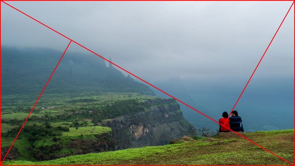 It’s kinda like the rule of thirds, but there we draw 2 vertical and 2 horizontal lines. Here we draw diagonal lines instead of straight ones. As with the rule of thirds, you’re aiming to put your point of interest over any point of intersection.