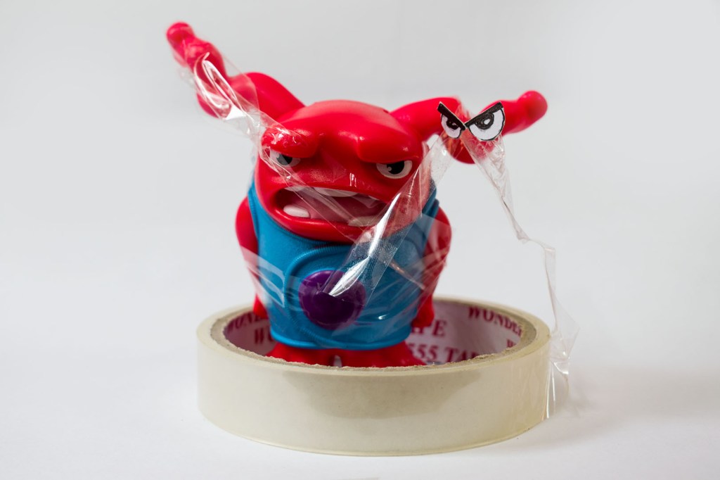 Goopy has fought with Mr Cello Tape and Mr Cello Tape has tied him up. I’ve made angry eyes on some card board and stuck it at the end of the cello tape, to show how angry he is.