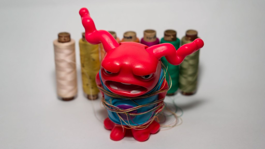 I’ve tied Goopy with some threads. So it looks like these spools are gonna kidnap Goopy.