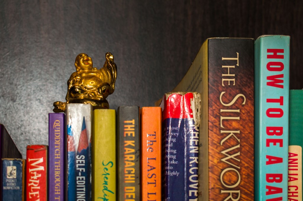 I have a Laughing Buddha and I’m gonna place him on a pile of books, to depict that books lead to happiness and peace.