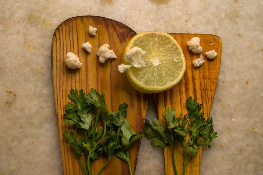 On some spatula, I’ve tried to make a scenery. Used coriander for trees, lemon as the sun, and some cauliflower as clouds.
