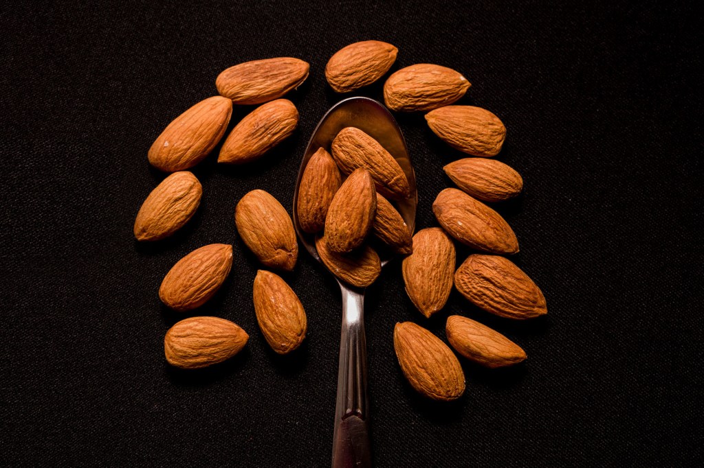 Same thing I can do with nuts. Some almonds placed on white paper.