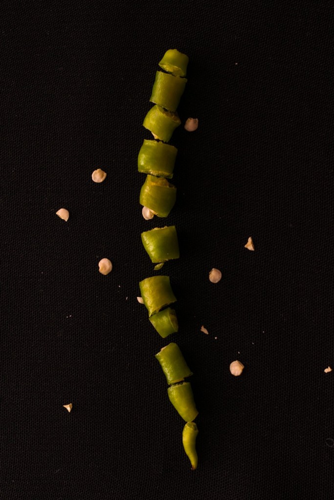 Take a chilly and just cut it up. And place it together like so, in the shape of a chilly on a black cloth background.