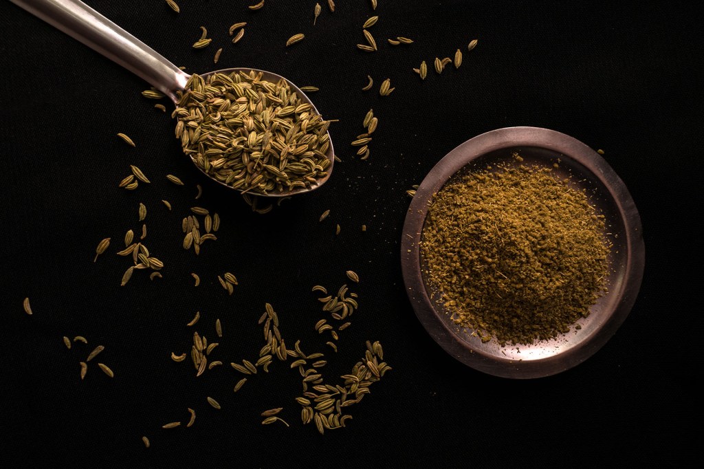 Some fennel seeds or saunf on a spoon. Also, its powder placed on a small plate.