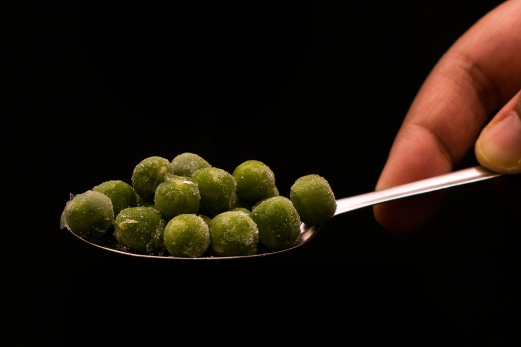 Green peas placed on a spoon and just held in front of my black background.
