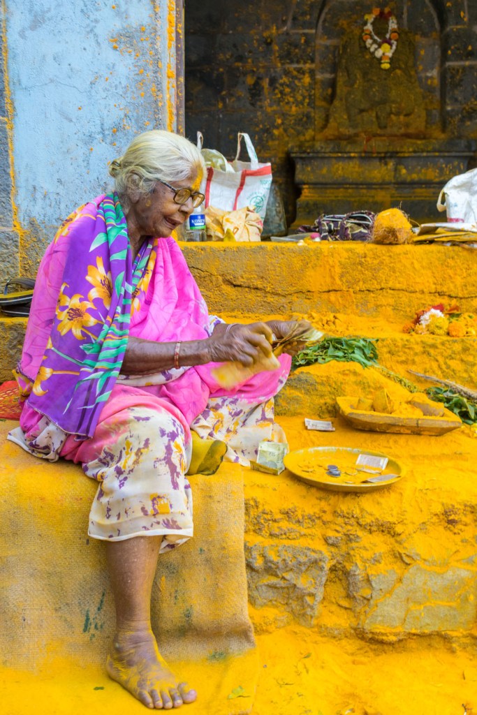 2. Architecture: Capture the intricate carvings and the contrast of turmeric-covered surfaces against the stone temple walls.