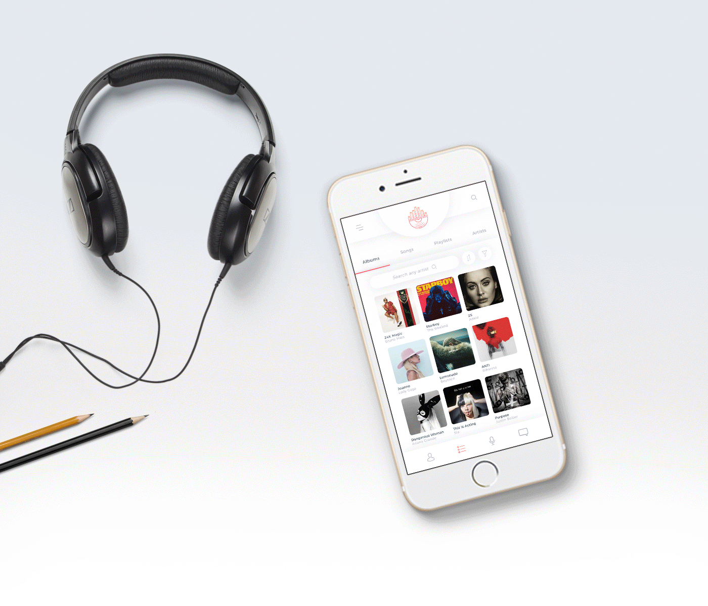 Interface design for a mock music app.